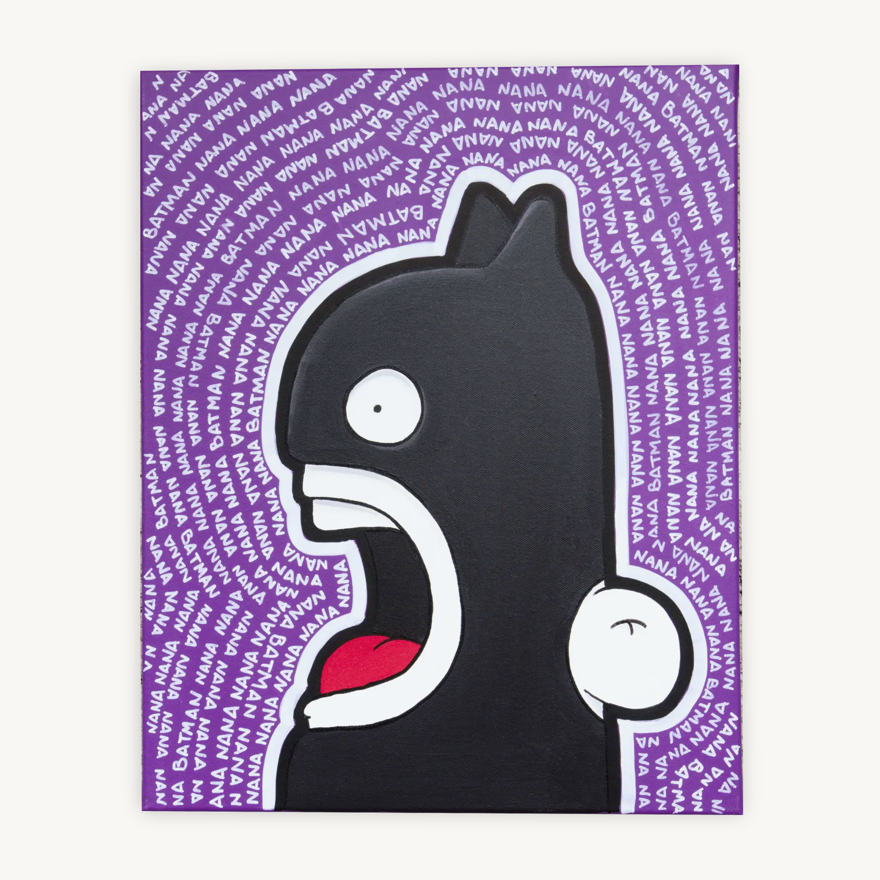 In Shouter vs Batman, the Shouter embraces the iconic Batman disguise, blending humor and nostalgia in this unique single-edition painting. The background echoes the classic “nananananananana Batman” line, a playful nod to the campy spirit of the original Batman TV show. This piece combines the Shouter's bold persona with Batman’s timeless appeal, adding a lighthearted touch to the Shouter’s world. Perfect for fans of classic pop culture with a modern twist!
