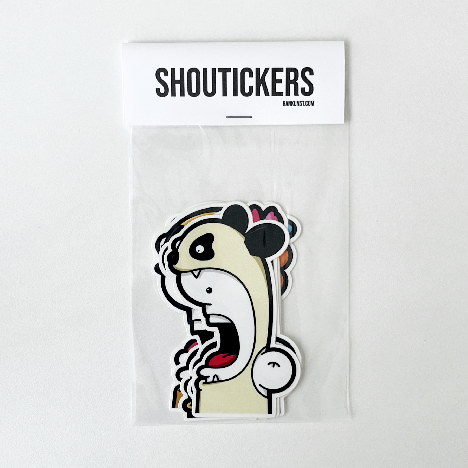 The Shouters vs Animals sticker pack contains 5 high quality durable vinyl Shoutickers. It features Shouter vs Panda, Shouter vs Pig, Shouter vs Furry, Shouter vs Fish and Shouter vs Bee. Each sticker is 8 cm (3.1 inch). tall Perfect for laptops, water bottles, and more. Durable, vibrant, and ready to stick anywhere!